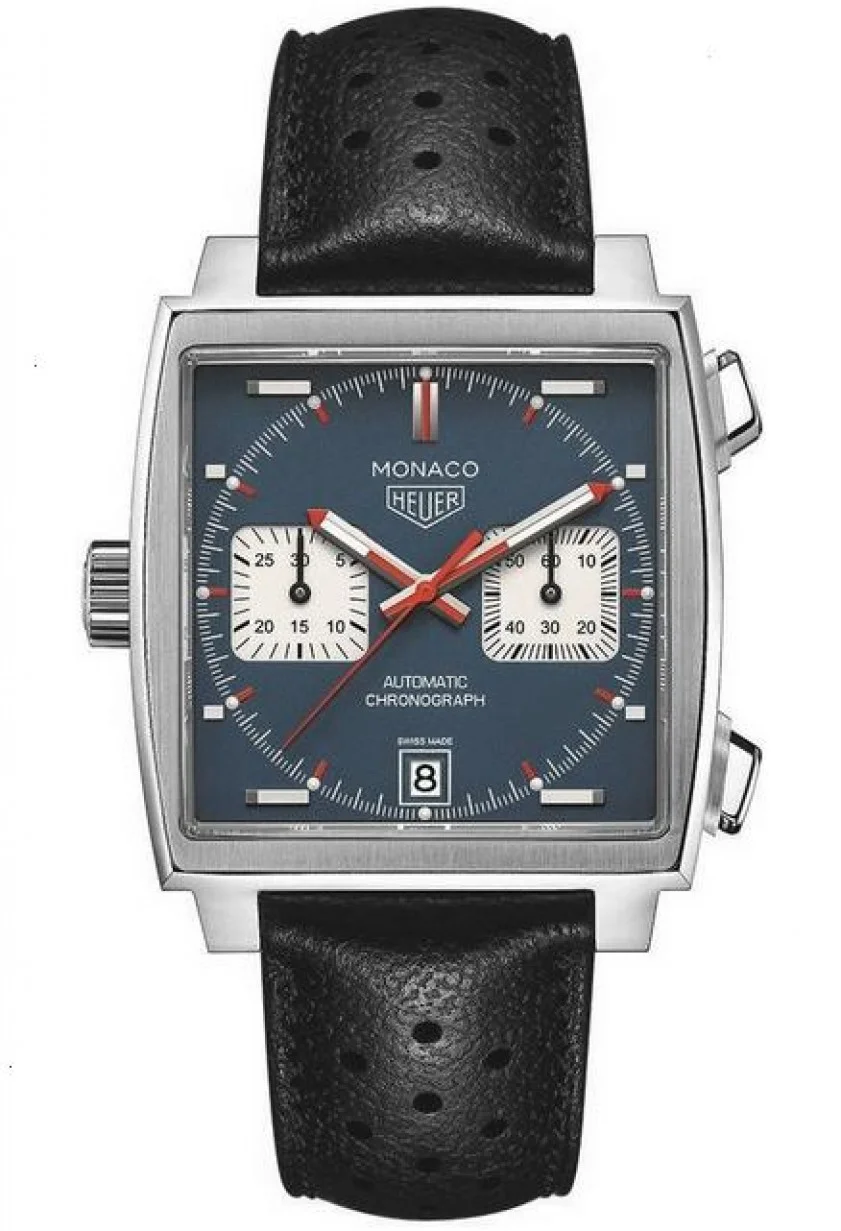 Distinctive square 39mm stainless steel case and square timing subdials against the blue dial, includes a sapphire case back that reveals the Calibre 11 automatic movement in action.