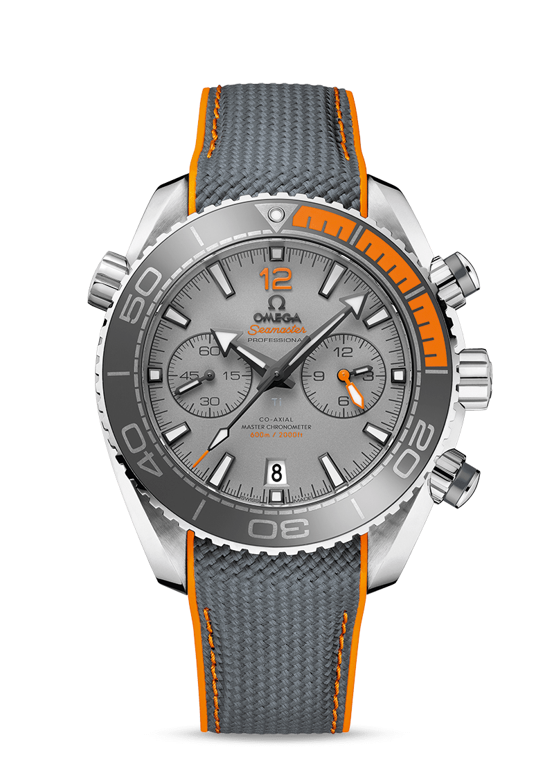This model is equipped with a scratch-resistant sapphire crystal, a sandblasted grade 5 titanium dial with Arabic numerals, and a date window at 6 o'clock. The dial is equipped with a small second hand dial, a 60-minute counter and a 12-hour counter, making it more convenient and intuitive to read the accumulated timing. 45.5mm grade 5 titanium case with gray silicon nitride ceramic bezel with orange rubber. The diving scale on the bezel is made of Liquidmetal™.